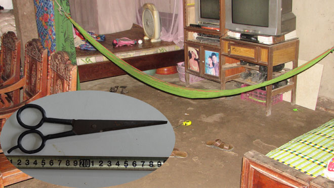 Hiện trường ngôi nhà xảy ra vụ án và chiếc kéo sắt hung khí gây án được cơ quan Công an thu giữ.