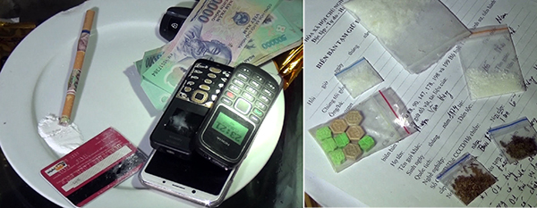 Khám xét tại hiện trường và nơi ở của Phạm Văn Hưng, lực lượng Công an thu giữ nhiều túi nilông chứa tinh thể trong suốt, màu trắng và 4 túi nilông bên trong có chứa 54 viên nén dạng ma túy tổng hợp, 1 súng hơi, 5 triệu đồng cùng nhiều tang vật liên quan khác. Xét nghiệm ban đầu có 36 đối tượng dương tính với ma túy.