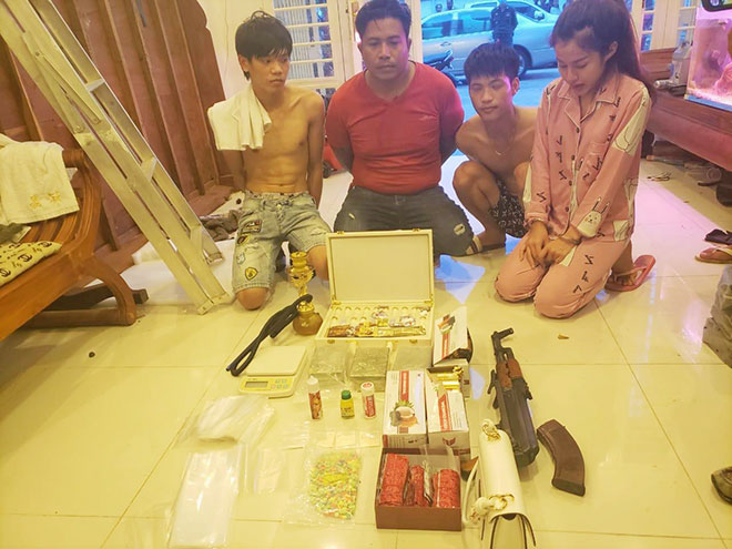 Tang vật thu giữ gồm: 1 khẩu súng AK báng xếp, 1 băng đạn 25 viên; 1 khẩu súng ngắn, băng đạn, 38 viên đạn; 2 xe ô tô mang biển số Campuchia, 3 xe máy và 513 viên ma túy, 19 gói ma túy, 15 lọ ma túy và dụng cụ hút shisha.