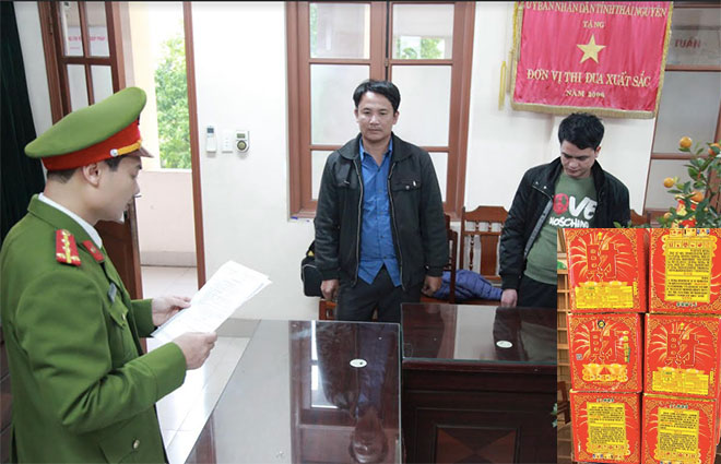 Trước đó, khoảng 9h ngày 22-1, tổ công tác của Phòng Cảnh sát kinh tế làm nhiệm vụ tại khu vực xóm Cây Thị, xã Yên Lạc, huyện Phú Lương thì phát hiện, bắt quả tang Đoàn Thanh Hải, 35 tuổi, trú tại xã Vô Tranh, huyện Phú Lương vận chuyển 29 hộp pháo (thường gọi là pháo giàn) đi tiêu thụ.