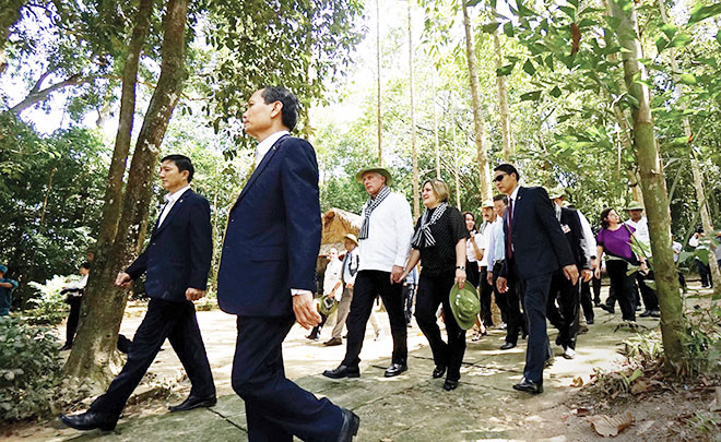 | Chủ tịch Cuba Miguel Diaz Canel cùng phu nhân và đoàn đại biểu cấp cao đến thăm địa đạo Củ Chi. |