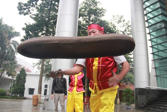 | Nghệ nhân đến từ Hải Phòng chuẩn bị để trình diễn pháo đất. |
