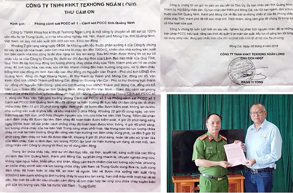 Công ty chúng tôi gửi lời cảm ơn sâu sắc tới Tỉnh ủy, UBND tỉnh và Thành ủy, HĐND, UBND TP Móng Cái cùng các lực lượng chức năng, nhất là CBCS Cảnh sát PCCC trong đó có CBCS Phòng CS PCCC số 1 đã nhiệt tình, trách nhiệm, dũng cảm giúp chúng tôi giải quyết sự cố hỏa hoạn vừa qua…”.