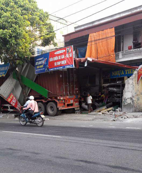 Tại hiện trường, chiếc container đâm sập phía trước của 2 ngôi nhà rồi dừng lại nằm lọt trong mái tôn của ngôi nhà thứ 3. Mảnh vỡ từ 3 ngôi nhà rơi vãi khắp đường.