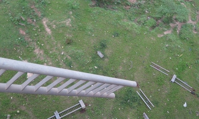 | Hàng chục mét lan can rơi xuống chân cầu. |