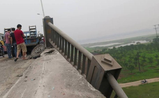 | Xe tải tông trúng lan can, khiến hơn 20m lan can văng khỏi thành cầu. |