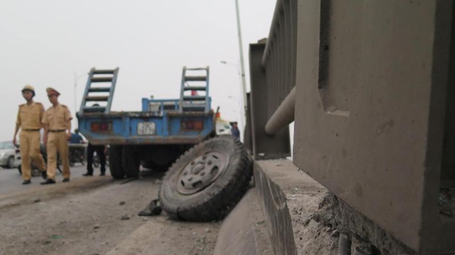 | Bánh xe trước xe tải văng ra ngoài, thành cầu bị vỡ nứt. |
