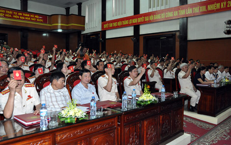 Các Đảng viên Đảng bộ Công an tỉnh Ninh Bình biểu quyết thông qua Nghị quyết Đại hội. |