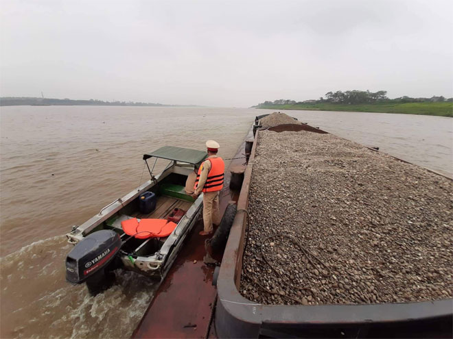 | Tàu khai thác cát trái phép trên sông Hồng bị phát hiện, bắt giữ. |
