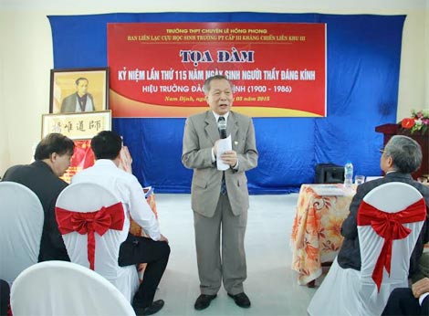 Tại buổi tọa đàm, GS.TS, NGND Đào Văn Phan, người con thứ bảy của nhà giáo Đào Văn Định đã thay mặt gia đình gửi lời cảm ơn sâu sắc nhất tới Ban Liên lạc cựu học sinh trường Phổ thông cấp III Kháng chiến Liên khu III, cảm ơn Ban Giám hiệu trường THPT chuyên Lê Hồng Phong đã dày công để tổ chức buổi tọa đàm tâm huyết và giàu ý nghĩa này. GS.TS Đào Văn Phan cũng đã rơi lệ khi nhắc đến người cha, người thầy thân thương đã ảnh hưởng lớn đến cuộc đời ông và các con trong gia đình. Ông nghẹn ngào cho hay, có lúc ông cũng không thể tin được vì sao bố mẹ ông đã vượt được bao khó khăn của cuộc sống tản cư để nuôi dạy 11 người con (1 người con là Đào Văn Phát đã mất khi còn nhỏ - PV) thành người, tất cả đều siêng năng học hành, trở thành các trí thức, có nhiều đóng góp cho quê hương, đất nước. “Có lẽ chính niềm tin mãnh liệt về kháng chiến, về Đảng và Bác Hồ đã trở thành lẽ sống, giúp bố tôi vượt qua mọi khó khăn, sắt son, thủy chung kiên định với con đường cách mạng và nghề dạy học mà ông yêu thích từ nhỏ” – GS.TS, NGND Đào Văn Phan tâm sự”… |