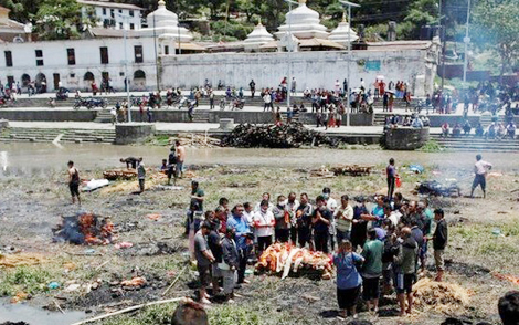 | Thiêu thi thể các nạn nhân gần 1 con sông ở Kathmandu (ảnh: Reuters). |
