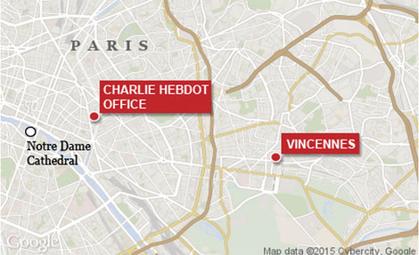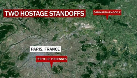 BBC: Phương tiện truyền thông Pháp cho biết một vụ bắt cóc con tin đang diễn ra tại tại cửa hàng của người Do Thái ở Porte de Vincennes gần Paris. Có ý kiến cho rằng các tay súng có thể là một trong những người đã bắn chết một cảnh sát hôm thứ Năm.