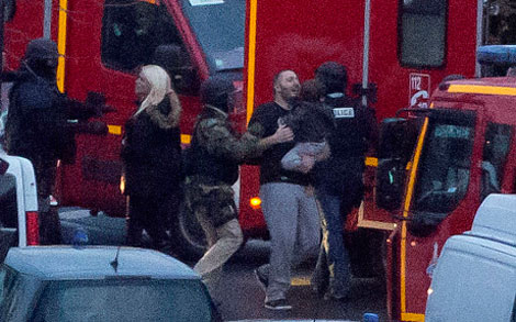 | Lực lượng cảnh sát đặc nhiệm Pháp đưa các con tin rời khỏi hiện trường. Ảnh: Telegraph. |