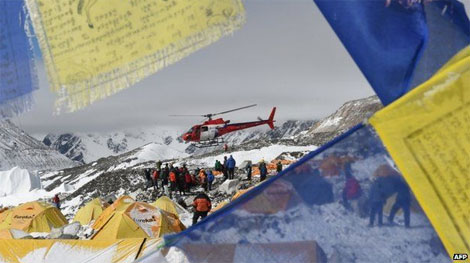 | Máy bay trực thăng cứu hộ chở những người bị thương từ Everest Base Camp. |