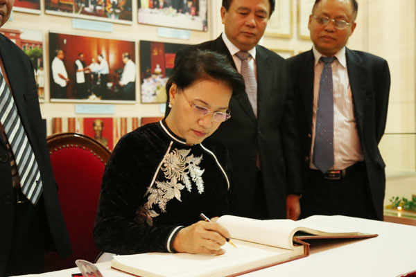 Bên lề cuộc nói chuyện với cán bộ, lãnh đạo quản lý, giảng dạy và nghiên cứu về Hiến pháp 2013, Chủ tịch Quốc hội Nguyễn Thị Kim Ngân đã tới thăm phòng truyền thống của Học viện Chính trị Quốc gia Hồ Chí Minh.
