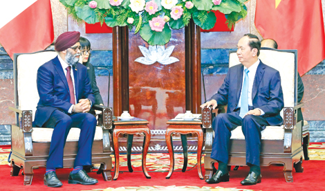 | Chủ tịch nước Trần Đại Quang và ngài Harjit Singh Sajjan, Bộ trưởng Quốc phòng Canada tại buổi tiếp. Ảnh: TTXVN |