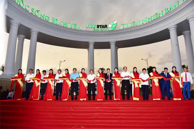 | Thủ tướng Nguyễn Xuân Phúc cắt băng khánh thành Cổng chào Thành phố Sinh thái Năm Sao. |