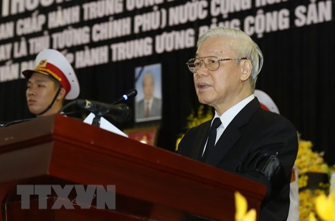 | Tổng Bí thư Nguyễn Phú Trọng, Trưởng Ban Lễ tang nguyên Tổng Bí thư Đỗ Mười, thay mặt lãnh đạo Đảng, Nhà nước đọc điếu văn tưởng nhớ và đưa tiễn đồng chí Đỗ Mười. (Ảnh: Trí Dũng/TTXVN) |