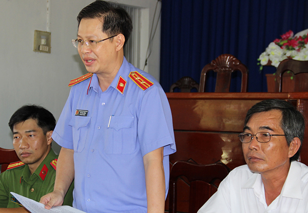 | Đại diện Viện KSND huyện Bình Chánh (TP Hồ Chí Minh) xin lỗi 3 thanh niên oan sai cùng người thân của họ. |