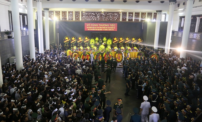| Sáng 30-6, lễ tang phi hành đoàn CASA 8983 diễn ra tại Nhà tang lễ Bộ Quốc phòng (Hà Nội) có 9 linh cữu phủ cờ quyết thắng, nhưng chỉ 8 thi thể được tìm thấy. Người trẻ nhất trong số họ mới 27 tuổi. Hàng nghìn người là thân nhân, đồng đội và cả những người dân chưa từng quen biết các liệt sĩ đã đến nhà tang lễ. Ảnh: Vne |