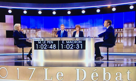 Nếu như bà Le Pen tỏ thái độ khiêu khích và khinh thường ra mặt đối với đối thủ - người mà bà gọi là cậu bé “Hollande” (Francois Hollande), thì ông Macron bày tỏ sự thất vọng và buồn trước “màn kịch” mà bà Le Pen diễn trên truyền hình, khẳng định đối thủ của mình “ăn nói lung tung” và cố tình gieo rắc sự sợ hãi để thu hút cử tri. Xuyên suốt cuộc tranh luận, ứng cử viên Macron thể hiện quan điểm vững vàng về một nước Pháp mạnh, trong lòng một châu Âu bảo vệ các quốc gia thành viên.