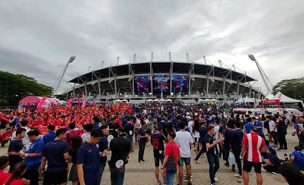 | CĐV Thái Lan và Việt Nam được chia vào những khán đài khác nhau, nên xếp thành hàng riêng để vào sân. Ảnh: VNE |