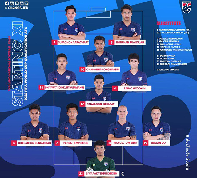18h00: HLV Nishino đã cất tiền đạo duy nhất là Supachai trên ghế dự bị. Tất nhiên ngôi sao sáng giá nhất của đội chủ nhà là Chanathip vẫn có mặt trong đội hình.