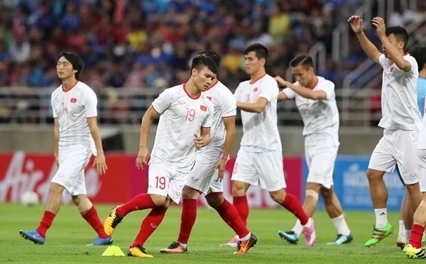 18h44: Nhóm cầu thủ đá chính gồm Ngọc Hải, Văn Toàn, Tiến Dũng, Hồng Duy khởi động cùng nhau. Thủ thành Văn Lâm được tin tưởng giao trọng trách làm "người gác đền" cho ĐT Việt Nam.