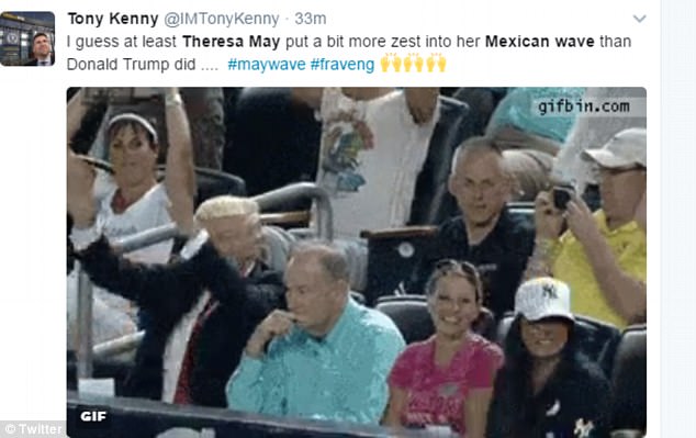 Những hình ảnh chụp được cho thấy bà May đứng lên và giơ cao hai tay để tham gia tạo "sóng người" trên khán đài dù có "lỡ nhịp" đôi chút so với các cổ động viên khác. Hình ảnh phấn khích của Thủ tướng Anh lập tức được chia sẻ chóng mặt trên mạng xã hội.