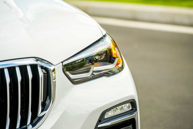 Điểm nổi bật nhất ở phần đầu xe chính là hệ thống lưới tản nhiệt hình quả thận đặc trưng với kích thước lớn hơn rõ rệt so với phiên bản tiền nhiệm cùng đường viền đơn. BMW X5 thế hệ mới được trang bị tiêu chuẩn hệ thống đèn trước thích ứng Adaptive LED.