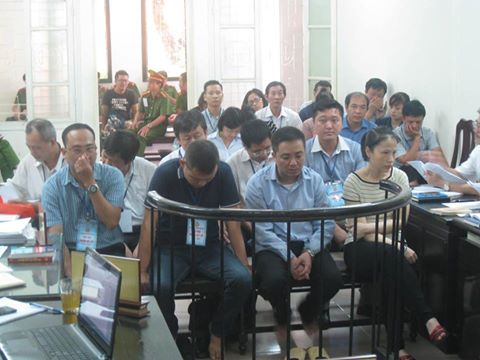 | Bị cáo Nhung- Đạt (hàng trên, bên phải) và đồng bọn tại phiên xử. |