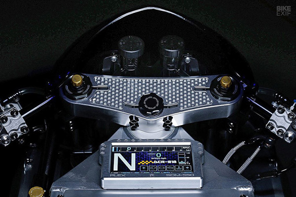 | Hệ thống phanh trên DCR-018 Billet Sting gồm 3 heo 4 piston kèm cùm phanh từ hãng ISR - tất cả đều được CNC nguyên khối. Các bình dầu cho tay côn và phanh nằm phía trên bộ chảng ba CNC to bản, với bề mặt tiện vân tổ ong như khung. |