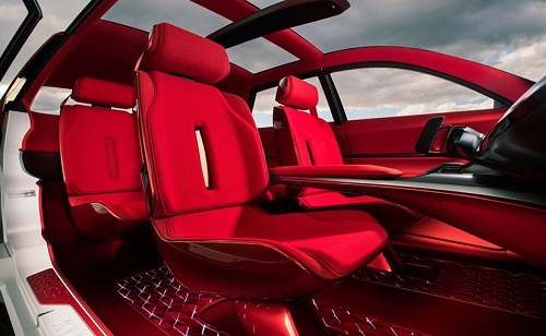 Bên trong nội thất, cabin được bố trí mang hơi hướng tương lai. Chiếc xe có nội thất Lava Red hoàn chỉnh được tạo điểm nhấn bởi hàng ghế trước được bọc vải boucle. Cabin sở hữu vô lăng hiện đại và hệ thống thông tin giải trí mà chúng ta chưa từng thấy trong bất kỳ bản concept nào khác.
