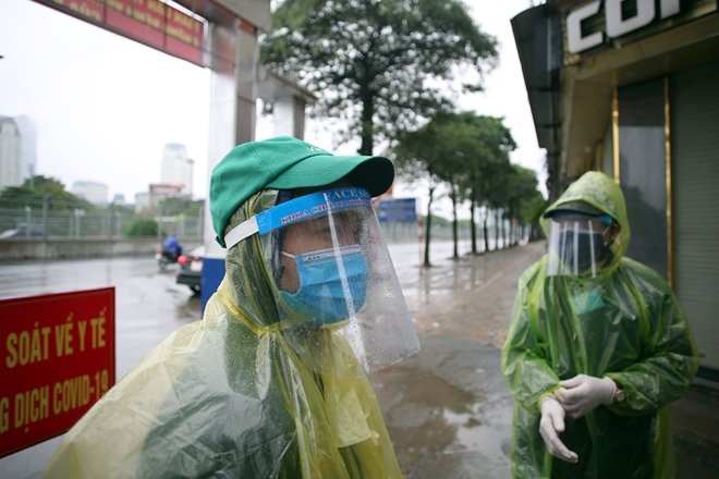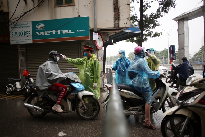 Cổng làng bún Phú Đô thuộc địa bàn phường Phú Đô (quận Nam Từ Liêm, Hà Nội) sáng 4/4, trong cái lạnh của cơn mưa phùn, lực lượng chức năng vẫn tiếp tục duy trì chốt kiểm tra y tế chống dịch COVID-19.