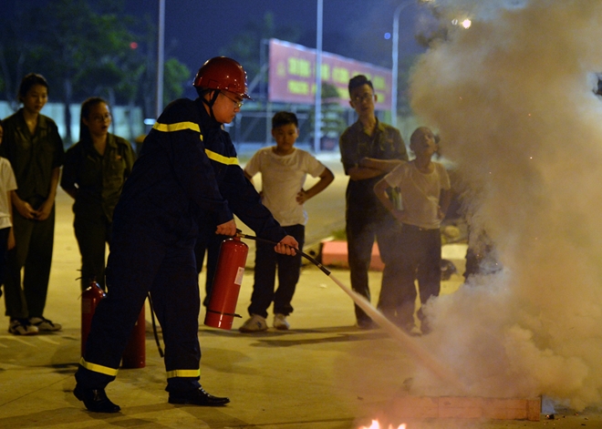 Trước khi được tự tay dập lửa, các e tập làm quen với cách mang và sử dụng bình bọt chữa cháy di chuyển một cách hợp lí.