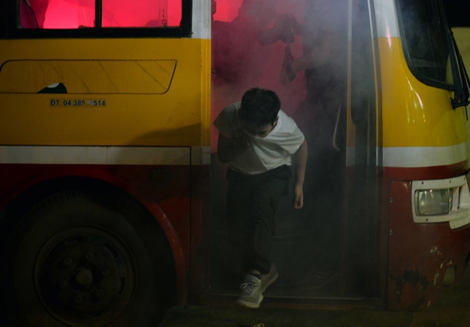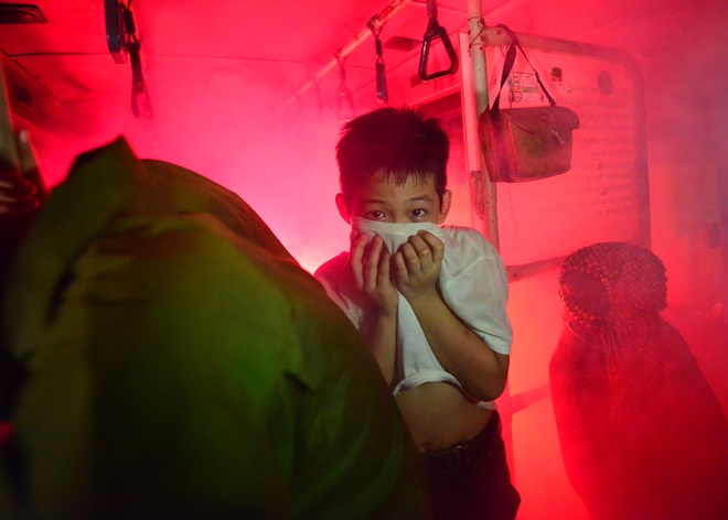 Với tình huống xảy ra sự cố khi đang đi xe buýt, các em được học cách quan sát khu vực nguy hiểm, cách phá cửa thoát hiểm và thoát ra tại vị trí an toàn.