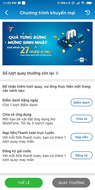 Tương ứng với mỗi giao dịch trị giá 50.000 đồng, thuê bao sẽ nhận được 01 lượt quay thưởng (không tính số dư). Ví dụ: Giá trị giao dịch của khách hàng là 120.000đ, thì số lượt = 2; Giá trị giao dịch của khách hàng là 210.000đ, thì số lượt = 4.