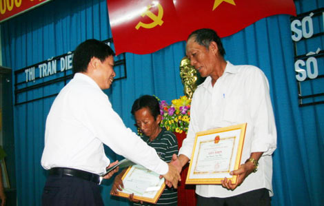| Lãnh đạo Chi nhánh Vietcombank tại Khánh Hòa trao tiền thưởng cho hai ôngNguyễn Văn Thời, Nguyễn Bảo Quốc. Ảnh : TTO . |