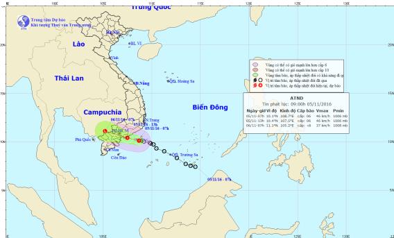Hiện nay, vị trí tâm áp thấp nhiệt đới ở vào khoảng 10,1 độ Vĩ Bắc; 108,7 độ Kinh Đông, cách bờ biển Bình Thuận - Bà Rịa Vũng Tàu khoảng 110km về phía Đông Đông Nam.