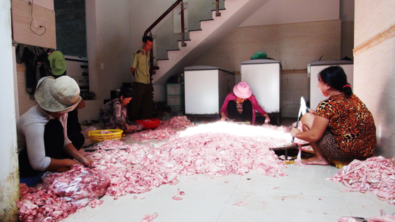 Bước đầu chủ cơ sở khai nhận đây là số hàng được cơ sở thu mua từ mỡ vụn, thịt ế tại nhiều lò mổ và các chợ sau đó đem về phân loại và tiếp tục đưa đi tiêu thụ. Lực lượng chức năng đã lập biên bản tịch thu toàn bộ thịt và mỡ bẩn trên để tiêu hủy theo quy định.