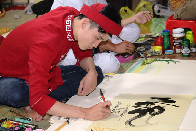 | Ông đồ trẻ Nguyễn Ngọc Tú say sưa vẽ thư pháp bán cho khách. |