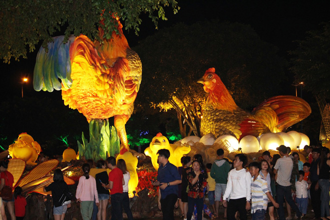 Lúc 21 giờ ngày 30-1, hai tuyến giáp công viên phải “chặn” lại dùng để giữ xe cho khách với giá 5.000 đồng/xe. Tất cả đường hoa trong công viên đông kín người đến du xuân. Các địa điểm: gia đình gà ấp trứng”, phố ông đồ luôn hút khách đến chụp ảnh xin chữ.