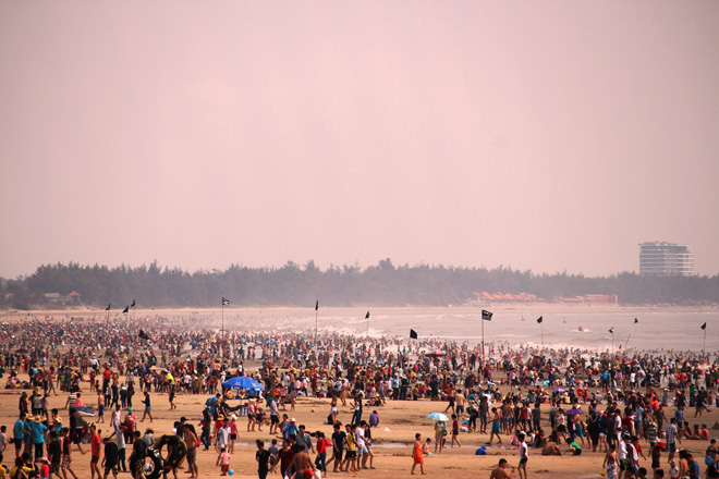 1. Ghi nhận lúc 10 giờ sáng ngày 31-1 (tức mùng 4 Tết Đinh Dậu ) tại bãi tắm Thùy Vân, hàng chục ngàn người nườm nượp về đây tắm biển. Thời gian này, mực nước bãi tắm hạ thấp, nắng nhẹ, nên du khách tắm biển đông kín.