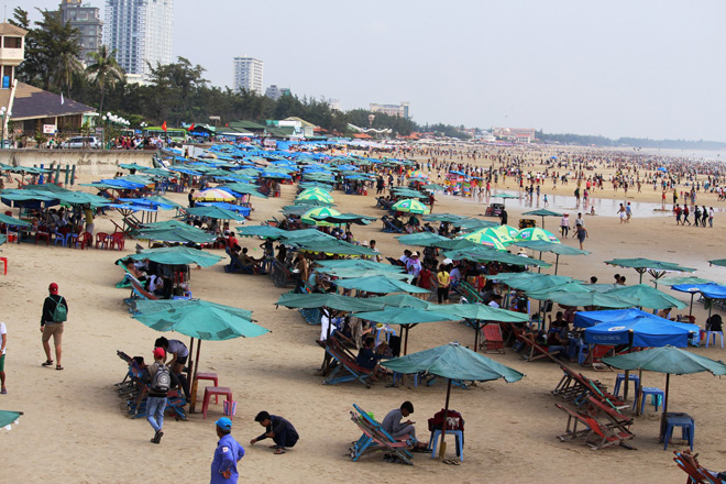 | Bãi tắm Thùy Vân Vũng Tàu sáng mùng bốn tết đông kín khách. |