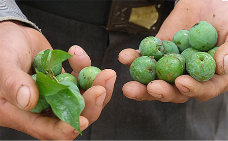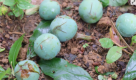 | Những quả mận đang vào thời điểm thu hoạch bị đá làm vỡ nứt, rơi rụng khắp nơi trong vườn. Quả mận khi rụng còn chưa chín nên cũng không thể tận dụng để làm gì. |