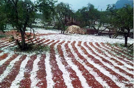 | Hai trận mưa đá lúc chiều tối ngày 14-4 (cơn mưa thứ nhất từ 17h đến 17h40, cơn thứ hai từ 19h15 đến 20h) trên địa bàn huyện Vân Hồ và thị trấn Mộc Châu (Sơn La) khiến hàng chục hecta hoa màu, cây ăn quả của người dân bị ảnh hưởng nặng nề. Lượng mưa dày, đường kính hạt đá từ 2 đến 5 cm. (Ảnh: Minh Thảo) |