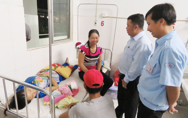 | Đại diện Hãng taxi Phú Quốc đến bệnh viện thăm hỏi mẹ con cháu bé. |