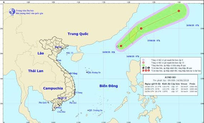 Đến 7h ngày 15-6, vị trí tâm áp thấp nhiệt đới ở vào khoảng 25,0 độ Vĩ Bắc; 122,5 độ Kinh Đông, trên vùng biển Đông Bắc Đài Loan. Sức gió mạnh nhất ở vùng gần tâm áp thấp nhiệt đới mạnh cấp 7 (50-60km/giờ), giật cấp 9.