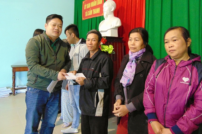 Ông Nguyễn Mạnh Linh, Giám đốc Công ty TNHH Kinh doanh thương mại và xây dựng Đại Phúc, đại diện nhà tài trợ, trao quà cho bà con xã Cẩm Thanh.