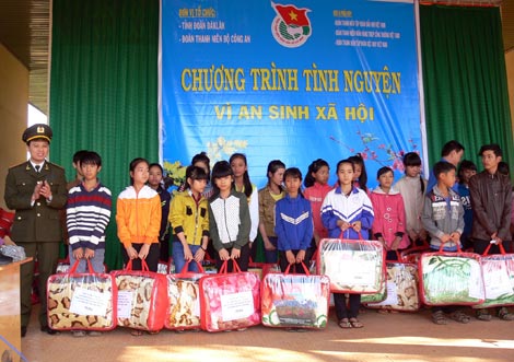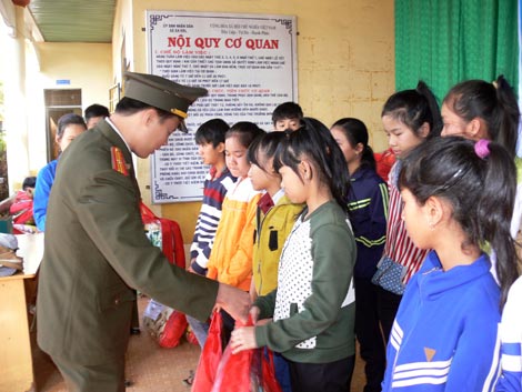 | Đại diện Đoàn thanh niên Bộ Công an và các đơn vị tặng quà cho các em học sinh nghèo vượt khó. |
